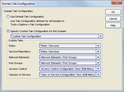 - Custom Tab Configuration - This configuration allows you to define which tab the different Policy Manager trees will be organized under. For Access Control and Classes of Service trees, you can also select to display the tree in a Configuration View (an external window) accessed from the Edit menu.
